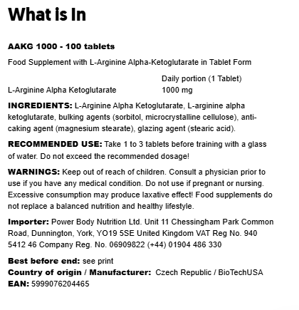 AAKG 1000 של BioTechUSA הוא תוסף תזונה ייעודי לספורטאים ומתאמנים, המכיל מינון עוצמתי של 1000 מ"ג L-Arginine Alpha-Ketoglutarate בכל טבליה.