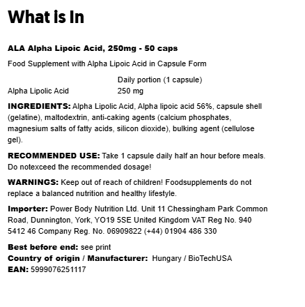 התוסף של BioTechUSA מספק 250 מ"ג ALA בכל קפסולה, במינון מדויק ונוח לנטילה יומית.