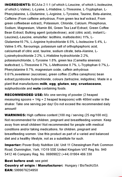 BioTechUSA Amino Energy Zero with Electrolytes מציעה נוסחה מתקדמת שמשלבת חומצות אמינו במינונים מדויקים עם אלקטרוליטים, וכוללת מרכיבים מעוררי אנרגיה קלים — כל זאת ללא תוספת סוכר.