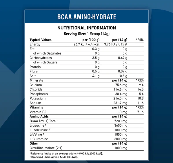 מכיל חומצות אמינו מסועפות (BCAAs) ביחס 2:1:1 לתמיכה בפיתוח השריר ובהפחתת עייפות