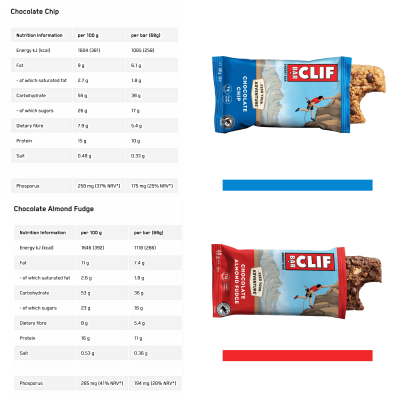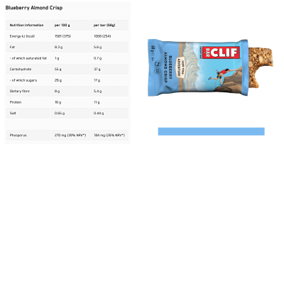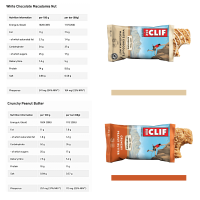 כל חטיף מספק כ-40 גרם של פחמימות עשירות באנרגיה. בנוסף לפחמימות, החטיף מכיל חלבון וסיבים תזונתיים המספקים אנרגיה לאורך זמן ושומרים על שובע, בין אם זה בזמן פעילות גופנית ובין אם צורכים כחטיף.