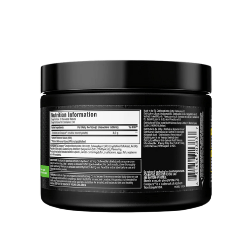 טבליות לעיסה טעימות ונוחות המכילות קריאטין מונוהידרייט איכותי (Creapure®), במינון מדויק של 3 גרם למנה. פתרון אידיאלי למתאמנים שמחפשים דרך קלה, מהירה וטעימה להכניס קריאטין לשגרה היומית – בלי צורך בשייקרים, ערבוב או מים.
