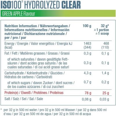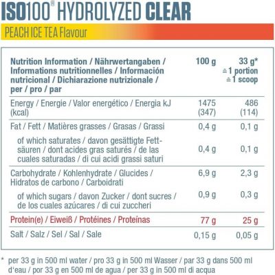 ISO100 HYDROLYZED CLEAR משלב חלבון מי גבינה מבודד ומפורק ואיזולט מי גבינה – הפורמולה האיכותית ביותר במגוון של DYMATIZE. חלבון מי הגבינה המבודד עובר פירוק להידרוליזה, שמפרקת אותו לרשתות קטנות של חומצות אמינו, מה שהופך אותו לקל לעיכול. ללא סוכר ושומן, ומנה מכילה פחות מ-114 קלוריות כשהיא מעורבבת עם מים.
