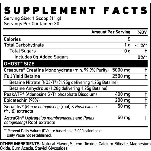 ערבבו כף אחת (12.5 גרם) של **GHOST® Size** עם 250-300 מ"ל מים או משקה לבחירתכם, כגון **GHOST LEGEND®** או **GHOST® BCAA**, עד 30 דקות לפני אימון בימי אימון. לקבלת תוצאות מיטביות, יש לצרוך את **GHOST® Size** באופן עקבי בימי אימון ומנוחה יחד עם שתייה מרובה של מים. אין לעבור 2 מנות ב-24 שעות.