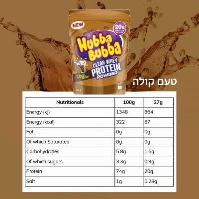 מגיע בטעם פטל כחול פירותי וקולה – כל מנה מספקת 20 גרם חלבון מי גבינה איכותי, ללא שומנים ורק 1.6 גרם פחמימות.