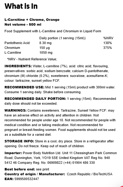 תוסף נוזלי איכותי מבית BioTechUSA, המשלב L‑קרניטין – חומצה אמינית המסייעת בהפיכת שומן לאנרגיה – יחד עם כרום, מינרל התורם לאיזון רמות הסוכר בדם ולתמיכה במטבוליזם של מקרונוטריינטים.