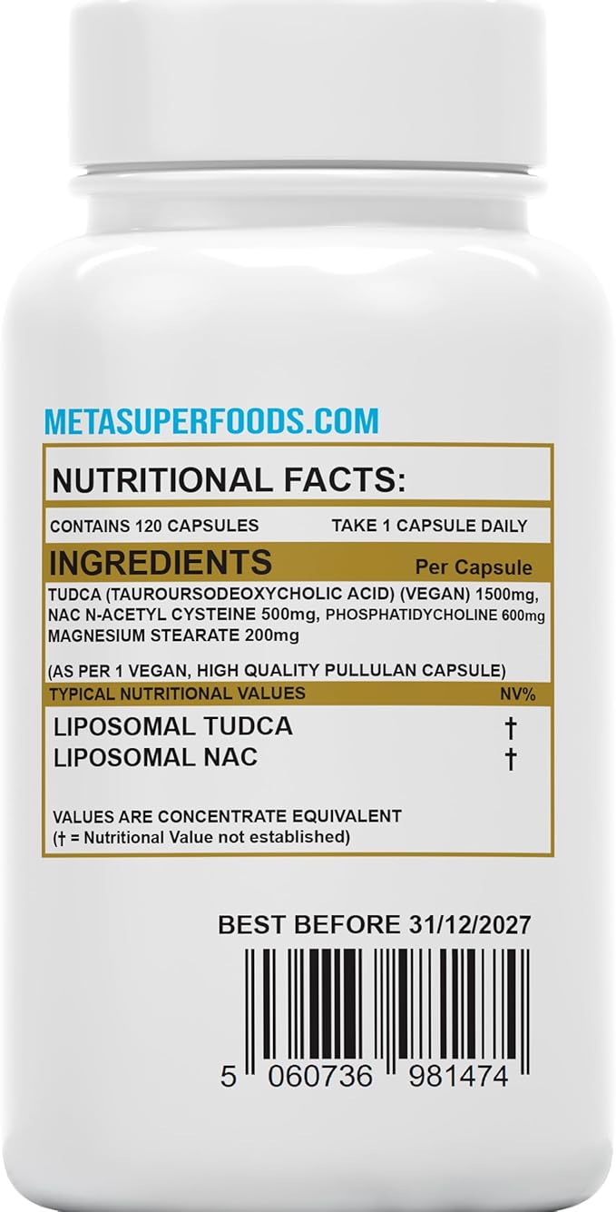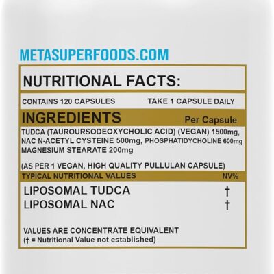 TUDCA (Tauroursodeoxycholic Acid) הוא חומצת מרה טבעית שמסייעת בשיפור בריאות הכבד, ומפחיתה את העומס על מערכת העיכול. המוצר הזה כולל 2000 מ"ג TUDCA לכל קפסולה, בשילוב עם N-Acetyl Cysteine (NAC) לחיזוק תפקוד הכבד, שמירה על בריאות המעי ומפחית חמצון. כל בקבוק מכיל 120 קפסולות, המתאימות למינון יומי של קפסולה אחת ליום, לשימוש במשך 4 חודשים.