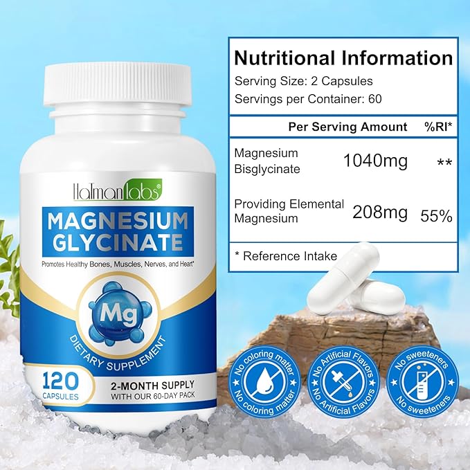 תוסף תזונה של מגנזיום גליצינט, שמספק ספיגה גבוהה ויעילות מרבית. כל קפסולה מספקת 208 מ"ג מגנזיום אלמנטלי – לתמיכה בבריאות העצמות, שרירים, מערכת העצבים ותחושת רוגע. מתאים לשימוש יומיומי במשך חודשיים. המגנזיום שבמוצר מסייע במניעת התכווצויות שרירים, שיפור איכות השינה והפחתת מתח נפשי.
