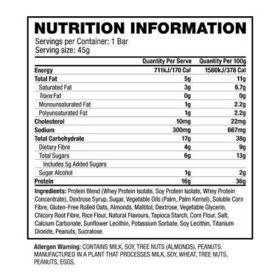 כל חטיף חלבון מכיל 16 גרם חלבון ממקור איכותי ביותר, רק 170 קלוריות, 5 גרם שומן, 17 גרם פחמימות איכותיות – עשיר בסיבים תזונתיים.