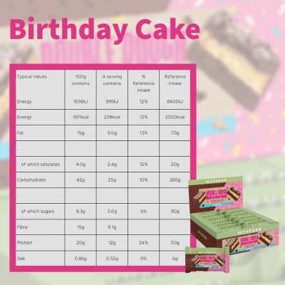 עוגת יום הולדת– בצק בראוני בטעם וניל (40%) (תערובת חלבונים (חלבון אפונה, חלבון חיטה, חלבון אורז), איזומלטו-אוליגוסכרידים (מקור לגלוקוז), חומר לחות (גליצרול צמחי), שמן לפתית, ממתיק (מלטיטול), שיבולת שועל. קמח, חומרי טעם וריח טבעיים, מתחלבים (לציטין לפתית, פוליגליצרול אסטרים של חומצות שומן, מונו-ודיגליצרידים של חומצות שומן), חומר הגבהה (נתרן ביקרבונט), צבע (קרמל רגיל), מווסת חומציות (חומצת לימון), מלח ים, גדילי סוכר (סוכר, שמן קוקוס, צבעים (תמצית פפריקה, אנתוציאנינים, כורכומין), רכז סלק, מים, סירופ גלוקוז, חומר זיגוג (שעוות קרנובה)), חומרי טעם וריח טבעי, מתחלב (לציטין לפתית), מלח ים), בצק עוגיות שוקולד צ'יפס כפול (40%) (תערובת חלבון (חלבון חיטה, חלבון אפונה), סיבי שורש עולש, סירופ גלוקוז, חומר לחות (גליצרול צמחי), שמן לפתית, סוכר חום, קמח שיבולת שועל, שוקולד צ'יפס (ממתיק (מלטיטול), עיסת קקאו, מתחלב ( לציטין סויה), אבקת קקאו, טעם וניל טבעי), אבקת קקאו, מתחלב (לציטין לפתית), מלח ים), ציפוי בטעם שוקולד מריר (10%) (ממתיקים (איזומלט, סוכרלוז), שמן דקלים, אבקת קקאו, מתחלבים (סויה). לציטין, פוליגליצרול פוליריצינולאט), שכבת טעם קרמל (8%) (אוליגופרוקטוז, חומר לחות (גליצרול צמחי), שמן שיאה, מים, חומר ג'ל (פקטין), אבקת קקאו, מתחלבים (מונו-ודיגליצרידים של חומצות שומן, לפתית לציטין) , מלח, טעם טבעי), שוקולד צ'יפס (2%) (ממתיק (מלטיטול), עיסת קקאו, מתחלב (לציטין סויה), אבקת קקאו, טעם וניל טבעי), גדילי סוכר (סוכר, שמן קוקוס, צבעים (תמצית פפריקה, אנתוציאנינים) , כורכומין), תרכיז סלק, מים, סירופ גלוקוז, חומר זיגוג (שעוות קרנובה)).