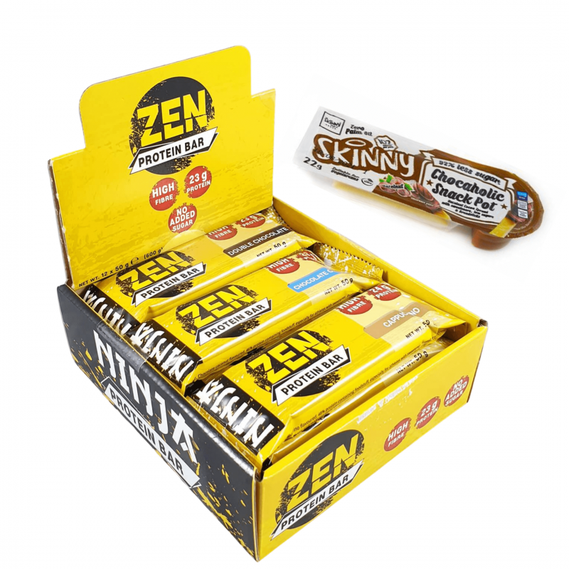 חדש וטרי על המדף! מארז של 12 חטיפי חלבון Zen מבית Ninja! כל חטיף שוקל 50 גרם ומכיל 23-24 גרם חלבון, עשיר בסיבים תזונתיים, דל פחמימה, דל סוכר, ללא גלוטן וללא לקטוז. החטיף מגיע בשלושה טעמים – דאבל שוקולד, שוקולד קוקוס, קפוצינו וכמו כן ניתן לקנות מארז המשלב את שלושת הטעמים.
