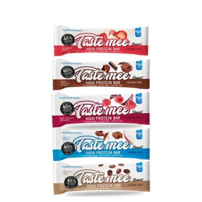 מארז של 20 חטיפי חלבון Taste Mee מבית Nutriversum, כל חטיף שוקל 50 גרם ומכיל 23-24 גרם חלבון, עשיר בסיבים תזונתיים, דל פחמימה, דל סוכר, ללא גלוטן וללא לקטוז. כל חטיף מכיל שמן קוקוס.