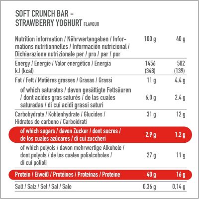 כל חטיף 40 גרם מכיל – על פי הטעם שוקולד תות יוגורט: