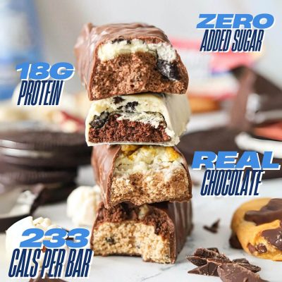 חלבון חלב, ממתיק (מלטיטול), חומר לחות (גליצרול), גרגרי ביסקוויט קקאו (8.4%) (ממתיקים: מלטיטול, אריתריטול, איזומלט, עמילן תפוחי אדמה, קמח תירס, חמאה, אבקת קקאו דלת שומן, קמח אורז, שומן חלב נטול מים, עמילן תפוחי אדמה שעבר שינוי, עמילן טפיוקה, אוליגופרוקטוז, מלח, חומרי טעם, תמצית וניל בורבון, חומר מתפיח (נתרן מימן פחמתי)), פפטידים של קולגן (בקר), שומן חלב נטול מים, חמאת קקאו, מים, אבקת חלב מלאה, פריכיות חלבון סויה עם קקאו (3.2%) (חלבון סויה מבודד, עמילן טפיוקה, קקאו דל שומן), עיסת קקאו, שמן חמניות, קקאו דל שומן, חומרי טעם, מלח, מתחלב (לציטין סויה), ממתיקים (אספרטיים, אצסולפאם K).