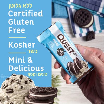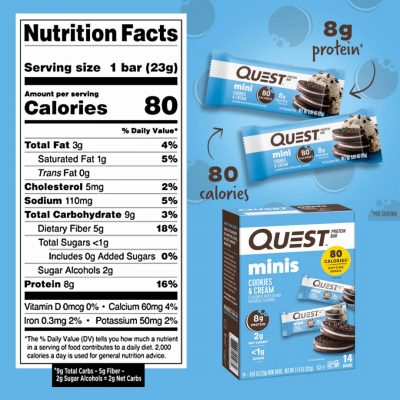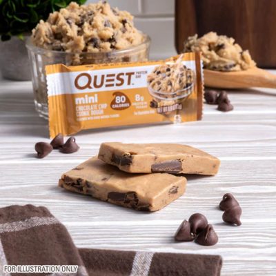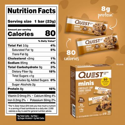 Quest Minis הוא חטיף חלבון בעל 80 קלוריות שתוכלו ליהנות ממנו בבית, בדרכים, או בכל עת שתזדקקו ל 8 גרם חלבון, עם 2 גרם פחמימות נטו ופחות מ-1 גרם סוכר לחטיף.