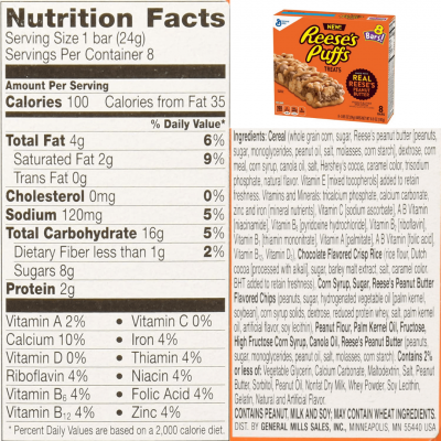 סוכר, קמח מלא, קמח חיטה, חמאת בוטנים של ריס (בוטנים, סוכר, מתחלב: מונוגליצרידים; שמן בוטנים, מלח, מולסה, עמילן תירס), סירופ תירס מיובש, קקאו מעובד עם אלקלי, שמן סויה ו/או זרעי כותנה, עמילן תירס שונה, תערובת (סודה לשתייה, נתרן אלומיניום פוספט), סירופ תירס, דגני תירס, עמילן תירס, תוספת צבע, מלח, תחליב (E477, E471), שמן דקלים, תחליב (E481), טעם טבעי ומלאכותי, מייצב ( מסטיק קסנתן), מתחלב (E466), חלב ללא שומן.