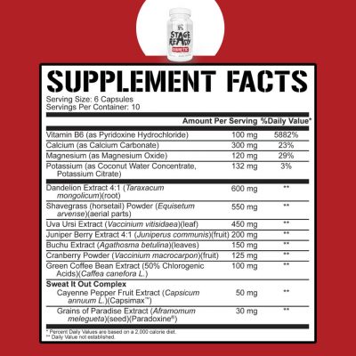 כשיצאנו ליצור את סוג המשתן הארדקור בו יתגאה ריץ', בדקנו היטב את כל אפשרויות הרכיבים האפשריות. כמובן, בחרנו רק את החומרים היעילים והבטוחים ביותר שיש. כלול בנוסחה עוצמתית זו 600 מ"ג של תמצית שן הארי, 550 מ"ג של Shavegrass, ו-450 מ"ג של תמצית Uva Ursi, וזו רק ההתחלה. יש הרבה יותר בנוסחת Stage Ready הכבדה שלנו כדי לעזור לך להשיל במהירות את משקל עודף המים. תגלו ש-"Sweat It Out Complex" שלנו יגביר את טמפרטורת הליבה של הגוף ויאיץ את תהליך השטיפה. לבסוף, אנו משפרים את Stage Ready עם אלקטרוליטים קריטיים כדי לחדש את הגוף שלך מרמות פוטנציאליות של דלדול.