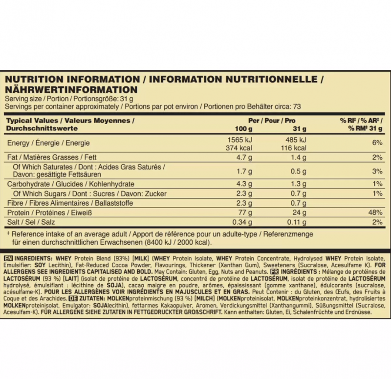 תערובת חלבון מי גבינה (93%) (חלב) (חלבון מי גבינה מבודד, חלבון מי גבינה מרוכז, חלבון מי גבינה הידרוליזטי), מחסמם: לסיתין סויה, קקאו דל שומן, טעמים, מסמיך (גומא קסנטן), ממתיקים (סוכרלוז, אצסולפם K)