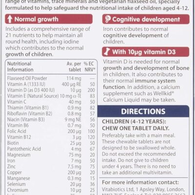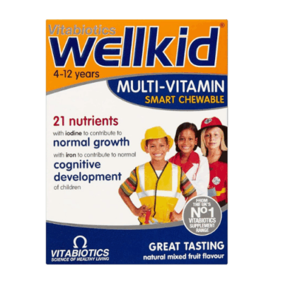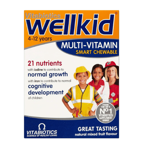 Vitabiotics Wellkid הוא תוסף מולטי-ויטמינים ייחודי לילדים, המגיע בטבליות לעיסה טעימות במיוחד. הטבליות מכילות שילוב של ויטמינים ומינרלים חיוניים שמסייעים בבריאות כללית, צמיחה והתפתחות, וכוללות ויטמינים A, C, D ו-E. התוסף תומך במערכת החיסונית, בבריאות העצמות והשיניים, ובבריאות כללית של הילד.