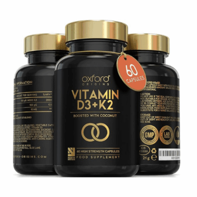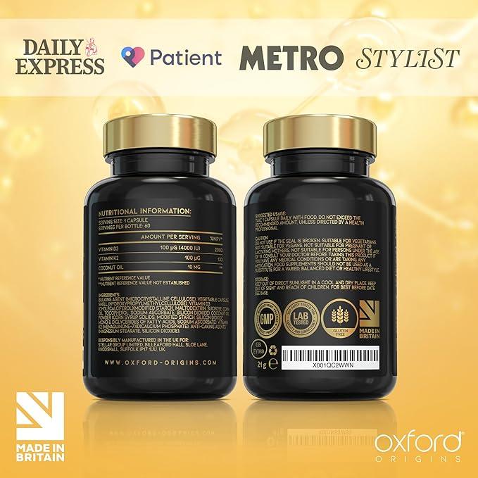 תוסף ויטמינים ברמת עוצמה גבוהה המשלב ויטמין D3 (4000 IU) וויטמין K2 MK7 (100 מק"ג) בתוספת MCT קוקוס לשיפור הספיגה. ויטמינים אלו תומכים בבריאות העצמות, מערכת החיסון, בריאות הלב ומסייעים בהפחתת דלקות. מתאים לצמחונים, מיוצר בבריטניה ואינו מכיל גלוטן או סוכר.